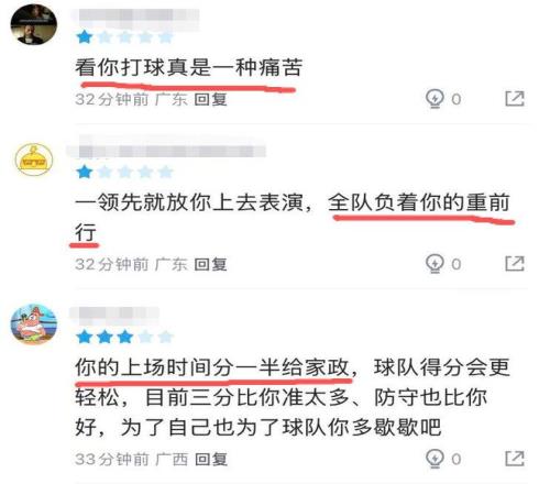 本轮广东以5分优势击败深圳的比赛,胡明轩仍然没有找回手感,且还在比赛中和深圳的马明坤发生冲突。而这个小插曲,也没能让胡明轩调整好状态,反倒是越打越急。整场比赛打下来,胡明轩在25分钟的上场时间里,5投1中,三分球4中1,仅得到3分,-6的正负值为全队最差,而他这3分,也是首发五虎中最低的那位。有球迷不禁感叹道:“看你打球真是一种痛苦”、“全队负着你的重前行”。