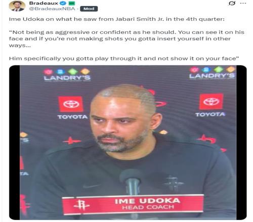 赛后乌度卡表达对小贾的不满:他打得没有侵略性/自信,他的脸上都是沮丧。如果投不进球就该用其他的方式融入比赛,他必须咬牙坚持下去,不能把绝望写在脸上。
