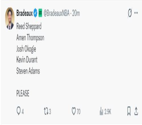 火箭记者Bradeaux:决胜时刻火箭应该用谢泼德、阿门、奥科吉、杜兰特、亚当斯。