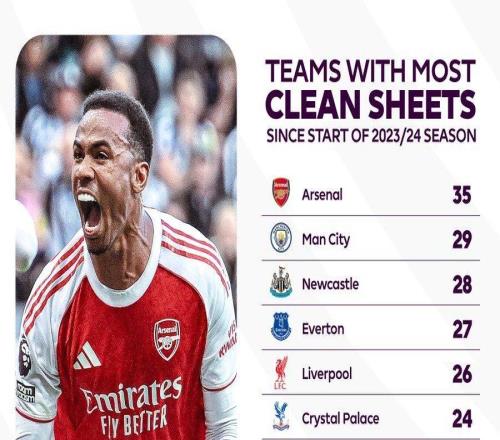 2324赛季以来英超零封对手次数最多的球队:阿森纳第一