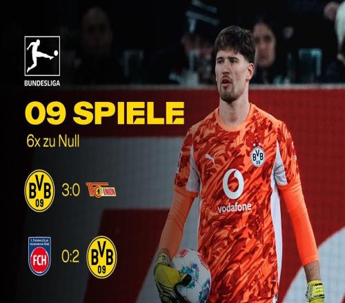 本赛季前9轮6场零封,多特与阿森纳并列五大联赛第一