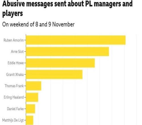 根据英国媒体的最新报道,在英超第11轮比赛期间,阿莫林、斯洛特和埃迪-豪是被攻击最多的教练。该媒体的一项调查发现,在一个周末期间,超过2000条极具侮辱性的社交媒体帖子——包